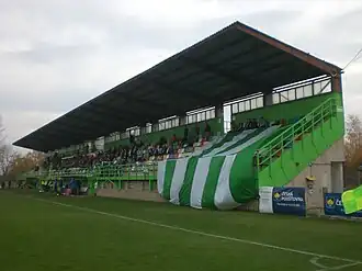 When FK Bohemians Prague played in the Czech First League between 2008 and 2010, the ground was not used for league matches, with the club using FK Viktoria Stadion and Stadion Evžena Rošického instead.[1][2] The club only used the stadium for training.[3] Before the club's promotion to the Czech First League in 2008, the club had played in Horní Počernice.[1] The club moved to the stadium in Střížkov in time for the 2011–12 season, in which they played in the 2. Liga.[4]