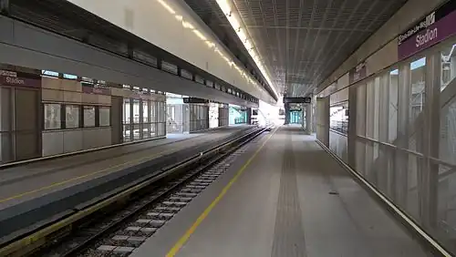 Stadion is a metro station on the U2 of the Vienna U-Bahn.[1] It is located in Leopoldstadt, Vienna's 2nd district. The station opened in May 2008 as part of the eastern extension of the U2.[2]
