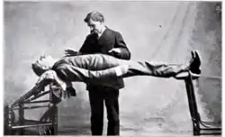 - Fake hypnosis tricks. Stage hypnosis literature contains a large repertoire of sleight of hand tricks, of the kind used by professional illusionists. None of these tricks requires any hypnosis or suggestion, but depend purely on physical manipulation and audience deception. The most famous example of this type is the "human plank" trick, which involves making a subject's body become rigid (cataleptic) and suspending them horizontally between two chairs, at which point the hypnotist will often stand upon their chest for dramatic effect. This has nothing to do with hypnosis, but simply depends on the fact that when subjects are positioned in the correct way they can support more weight than the audience tends to assume.[20]