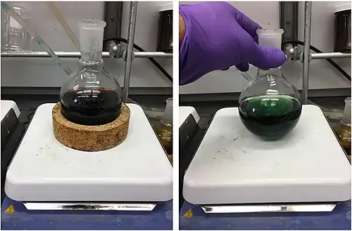 Following the success of this initial disclosure, Hoover and Stahl went on to publish a further simplified protocol for rapid benzylic alcohol oxidation with Nicolas Hill, director of undergraduate organic chemistry laboratories at the University of Wisconsin - Madison.[2][23] Utilizing a less expensive solvent and copper source, Hill, Hoover, and Stahl demonstrated that higher catalyst loadings could be economically achieved. In doing so, the oxidation of alcohols could be accelerated for use as a practical educational tool in undergraduate labs. Furthermore, reaction completion is typically indicated by a change in solution color for red/brown to green resulting from a change in the copper species' resting state.[2] This is unique for benzylic and other activated alcohols, as the rate-limiting-step for these substrates is catalyst re-oxidation, which differs from aliphatic alcohols where the rate limiting step is C-H cleavage.[24] The Stahl oxidation is a component of the undergraduate organic chemistry laboratory curriculum at UW-Madison and the University of Utah.[25]