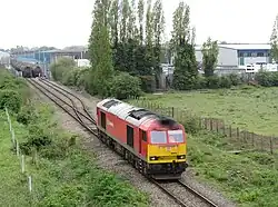 In the early 1980s, the southern part of the line was severed by the construction of the M25 motorway. Junction 14 was built on the site of Poyle Halt and part of the trackbed to the south was covered by the new road.[20] The final train to reach Staines, a freight working to the oil terminal, ran on 16 January 1981.[3] The line north of Colnbrook was retained to serve the factories and depots in the area.[3]