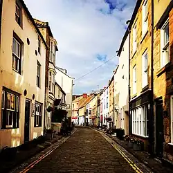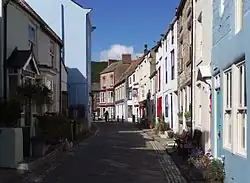 The oldest and best-known part of the village is clustered around the sheltered harbour, bounded by high cliffs and two long breakwaters.[9] The more modern upper village is located at the top of the hill, centred on the junction of the High Street and the A174 road.[10]