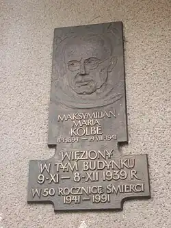 The camp was established in September 1939, shortly after the invasion of Poland which started World War II, as a Dulag transit camp for Poles. It was located in over 30 buildings and places throughout the town.[2] Some 22,000 Polish POWs and 12,000 Polish civilians passed through the camp.[2][3][4] Also Franciscans from Niepokalanów were held there, including Maximilian Kolbe,[4][5] who was later killed in the Auschwitz concentration camp and is now considered a saint of the Catholic Church.[6] Conditions in the overcrowded camp were poor, food was scarce, sanitary conditions were bad and medical aid was practically nonexistent.[3][7] There were cases of abuse of wounded or sick POWs by German doctors, and one even recommended "treating dysentery patients with starvation."[7] To aid the prisoners, the Poles of Ostrzeszów smuggled food, clothing, shoes, blankets and books for the camp's inmates, as well as assisted in escapes from the camp.[8] In retaliation, the Germans carried out the first expulsions of Poles from Ostrzeszów already in September and December 1939, and murdered a number of Polish hostages from the town during the large massacres of Poles in Winiary.[9]