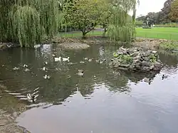 The site on which the park lays was owned by the Earl of Stamford in 1668 and was part of a deer park.[1] During the Industrial Revolution the population of the area was in poor health and began to demand a park to enjoy on their day off. In 1856 a letter was sent to the Ashton Reporter requesting the cotton mill workers raise money for a park. Fundraising began and in 1872 Highfield House and grounds was purchased, the Earl donated adjacent land and Stamford Park was opened officially on 12 July 1873. The Lord and Lady Stamford arrived for the opening and the towns of Ashton, Stalybridge and Dukinfield were decorated out in bunting and flags. A crowd of up to 80,000 watched the opening ceremony.[2] The park continued to expand for the next two decades with the purchase of further land, a reservoir was purchased which was turned into the boating lake in the South and a fishing lake in the North.[3] The Coronation Gates were installed in the 1950s to celebrate the Coronation of Queen Elizabeth II.[2]