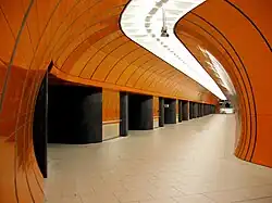 The four stations Olympiazentrum, Petuelring, Scheidplatz and Bonner Platz, are all made of exposed concrete with reliefs on the walls, while the orange color for the U3 is reflected in the line band and other architecture in the station. They deviate in form and design quite strongly from the basic form of the, only shortly before planned and executed stations of the U6, - due to the Olympic decision and the associated reputation justifying an independent appearance of the stations.