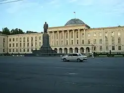 The bombing resulted in the deaths of Storimans, who suffered a fatal head wound,[11] and 11 Georgian civilians.[12] More than 20 other people were injured, including Yecheskeli, who was severely wounded and evacuated to Israel for treatment after surgery in Tbilisi,[9][13] and Akkermans and the taxi driver, who both sustained nonthreatening leg injuries.[8] All had been struck by shrapnel from a projectile that had impacted near the city's three-story television and radio center where a top-floor media center had been set up, some 200 meters/yards from Gori's city hall.[14][15] Other buildings in the immediate area had also been hit, but no structural damages were reported. Immediately after the explosion, two small craters were found on the square, as well as the remains of the then-unidentified projectile.[8]