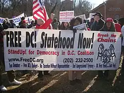 Stand Up! for Democracy in D.C. Coalition, commonly referred to as simply Stand Up! or "Free DC!", is a grassroots, nonpartisan citizens advocacy group and 501(c)(3) nonprfit organization. Founded in 1997, the aim of Stand Up! is to achieve total statehood for the District of Columbia, defined by the group as recognition of the District of Columbia's long-standing petition for statehood, complete control of the local budget, with no review or veto by Congress of the District's budget or local laws, its own locally elected or appointed judges, and full voting representation in the United States House and Senate.[1]