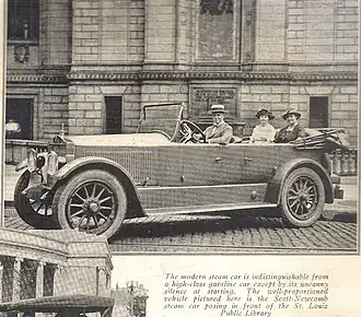 L. L. Scott and E. C. Newcomb developed a steam car claimed to be able to raise a full head of steam within a minute. . Also known as the Scott-Newcomb, it featured a front condenser that resembled a Rolls-Royce shaped radiator and was similar in appearance to the Roamer. The car had a twin-cylinder horizontal steam engine and used kerosene for fuel. The boiler pressure was stated as 600psi.[1][2]