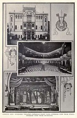 In its first two years, the Standard Theatre presented a variety of performances at low cost. The musical repertoire included southern folk songs, antebellum plantation songs, vaudeville numbers, musicals, and blues. The theater also showed fantastic performances, including magicians, acrobats, and animal performances. For example, a performance in February 1915 featured the Monkey Cabaret Orchestra, consisting of eight monkeys in the orchestra who accompanied more monkeys performing on stage with a dog.[10] Gibson took pride in his performers. When asked by a reporter what the theater relied on most, he replied "Good acts, well acted... it has been and will continue to be my method to regard the actor as a medium and not as a marionette."[11] In November 1915, Gibson finished renovations on the Standard Theatre. The renovations included newly painted interior, gilded ceilings, and increased seating to 2,000. While renovating his theater, Gibson employed African-American painters, artists, and construction workers in his efforts to spread wealth among the African-American citizens in the area.[12] After this point, Gibson claimed to have a standing offer for $180,000 for the theater, which he regularly declined: "Commercialism has nothing whatever to go with my project," he said. "My idea is to give my people the best of it all the time."[13]