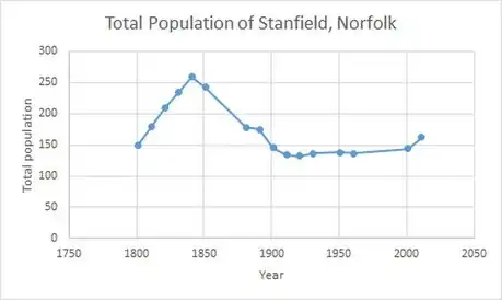 The total population graph illustrates that in 1801, its population consisted of 149 inhabitants. Since then it had dramatically increased in 1841, whereby it had a total population of 259. However, there is not much literature regarding why there was a dramatic increase of population in 1841. Furthermore, since then its population have been decreasing and have stayed stagnant from 1911, up until the early 2000s, whereby its population shows that it has significantly increased again. In relation to the 2001 Census Report, Stanfield's population was 144.[11] However, in comparison to the 2011 Census, it is evident that it has increased to a total population of 162.[11] In regards to Stanfield's age structure, 26.7% of Stanfield's total population is aged between 45 and 59 years old according to the 2001 Census Report.[12] The mean average age of Stanfield can be estimated as 42.4 years old based on the 2001 Census Report. In comparison to the 2011 Census Report the mean average of the population of Stanfield is 39.1 years old.[13]