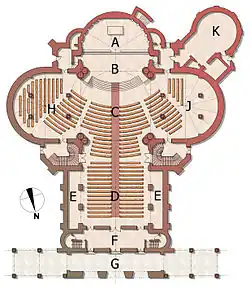 The church is a cruciform structure; its original structure, which included a clock and bell tower with an 80-foot (24 m) spire, was 190 feet (58 m) long and 150 feet (46 m) wide.[15] The facade faces the Inner Quad, and is connected to other buildings by arcades which extend laterally. The entry is through a narthex or vestibule extending across the building. The nave has a single aisle on either side, separated by an arcade with a clerestory above it. The crossing is formed by a structure of square plan which once supported the central tower. Over it is a shallow dome supported on pendentives and rising to a skylit oculus. High semicircular Romanesque arches separate the crossing from the nave, transepts and chancel. The chancel and transepts are apsidal. There are deep galleries with concave balustraded fronts in the transepts and an organ gallery above the narthex. The sanctuary, in the chancel, is elevated and approached by steps. A round-shaped room is at the back of the building, added in 1902 by architect Clinton Day.[75]