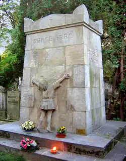 In 1912 Jackowski designed the Powązki Cemetery tomb of his uncle, novelist Bolesław Prus. The monument bears on three sides, respectively, the writer's actual name Aleksander Głowacki, his dates of birth and death, and his pen name Bolesław Prus. On the fourth side is the inscription "Serce serc" ("Heart of hearts"), borrowed from the Latin inscription "Cor cordium" on the tomb of English Romantic poet Percy Bysshe Shelley in Rome's Protestant Cemetery;[1] and below this inscription is the figure of a little girl embracing Prus' tomb — a figure emblematic of Prus' well-known empathy and affection for children.[2][3]