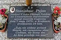 Stanisław Włodzimierz Pyjas[2] (1953–1977) was a Polish student of the Jagiellonian University in Kraków, member of the anticommunist student movements. He died on 7 May 1977, in Kraków. The exact circumstances of Pyjas’ death are still a mystery[3] and his case, which is still disputed, shook public opinion in Poland. According to one scenario he was murdered and the killers, probably members of the communist Secret Services, arranged the death to look like an accident.[4] The official scenario, however, states that his death occurred after he fell from the stairs while being drunk. In 2011 his body was examined, and the outcome states that it was the fall that caused his death and that he had not been beaten.[5]