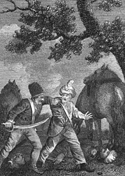 Sočivica's men captured a Turk who had earlier helped one of his brothers to escape, and the brother, in opposition to the chief and the rest of the band, was anxious to return the favour.[14] Although the Turk was destined to die, the grateful brother, while Stanko was at prayers, set him free.[14] The other hajduks were outraged, and one of his nephews even punched him; the brother then drew a gun and killed him on the spot.[14] Sočivica expelled his brother, and after the funeral of his nephew, felt such a humiliation that he decided to retire.[14]