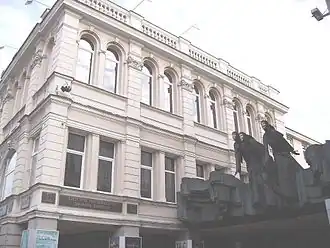"Mūzų šventė" ("Festivity of Muses", also known as "Feast of Muses", or "Three Muses") is a sculpture group (copper sheets, gilding) of three female figures in shawls portraying Drama (Calliope), Comedy (Thalia) and Tragedy (Melpomene) on the façade of the Lithuanian National Drama Theatre.[5][6]