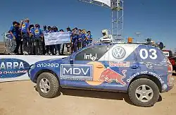 Led by Associate Professor Sebastian Thrun,[2] director of the Stanford Artificial Intelligence Lab, the Stanford Racing Team was developed solely for the purpose of competing in the 2005 DARPA Grand Challenge. Stanford did not participate in the 2004 DARPA Grand Challenge and was considered to have 20:1 chances of winning the 2005 competition.[3] The car, a modified Volkswagen Touareg crossover SUV, is currently located at the Smithsonian American History Museum. It was displayed at the 2006 New York International Auto Show and two years at the Volkswagen Autostadt Museum (Germany). The Stanford Racing Team entered a new vehicle, also a modified Volkswagen Touareg, dubbed "Junior", in the 2007 DARPA Urban Challenge.[4] Other key contributors on the team include Michael Montemerlo (software lead), Sven Strohband (lead hardware engineer), David Stavens (roboticist/engineer), Hendrik Dahlkamp (computer vision lead), Cedric Dupont (vehicle lead), and Pamela Mahoney (communications lead).[5]