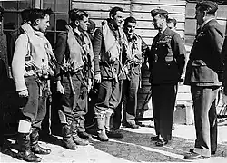 Weather conditions meant there was little operational flying over the winter of 1941 and into early 1942 but the pace of operations soon picked up and the squadron began to regularly fly to German-occupied France, escorting bombers or carrying out sweeps to draw out the Luftwaffe.[5] On 29 April, King George VI visited Kenley to observe the squadron while it was on an operation. Browne was the last pilot to land. He overshot slightly on his landing and required the services of a tractor to turn his Spitfire around before he could taxi to the dispersal area and meet the King.[6]