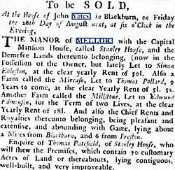 His eldest surviving son, Joseph Yates, was the next owner of the house. He was a barrister, and in 1714 he married Ellen Maghull. The couple had two sons: Maghull Yates and Joseph Yates. The latter became a judge and received a knighthood. The biography of Sir Joseph Yates is at this reference.[8] The Yates family decided to sell the house in 1768, and the sale notice is shown.
