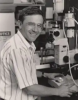 Korsmeyer studied biology as an undergraduate at the University of Illinois Urbana-Champaign, completing his BS in 1972.[2] He then moved on to medical school at the University of Illinois College of Medicine in Chicago.[5] Here Korsmeyer's talent was recognized by the hematology division chief Paul Heller, who encouraged Korsmeyer to pursue a research career.[5][1] Heller arranged for Korsmeyer's first research experience, with Robert Strickland at the University of New Mexico which resulted in Korsmeyer's first scientific publication, a 1975 paper in PNAS.[5][6] Korsmeyer completed his MD in 1976,[4] then moved to the University of California, San Francisco for his intern and residency.[1] In 1979, he moved to the U.S. National Institutes of Health as a research fellow under Thomas A. Waldmann.[7][8] Collaborating with Philip Leder's group, Korsmeyer defined the chromosomal translocation that underlay most follicular lymphoma, naming the affected gene Bcl-2.[5]