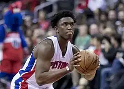 On June 25, 2015, Johnson was selected with the eighth overall pick in the 2015 NBA draft by the Pistons.[7][8] In his debut for the Pistons on October 27, he recorded seven points, four rebounds and three assists off the bench in a 106–94 win over the Atlanta Hawks.[9] On November 9, he recorded 20 points and seven rebounds in a 109–95 loss to the Golden State Warriors.[10] On February 4, while starting at shooting guard in place of the injured Kentavious Caldwell-Pope, Johnson scored a season-high 22 points in a 111–105 win over the New York Knicks.[11]