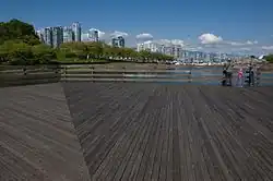 The walkway was extended several times and, as of 2023, is 22 kilometres (14 mi) from end to end, making it the world's longest uninterrupted waterfront walkway.[36] The Stanley Park portion is just under half of the entire length, which starts at Canada Place in the downtown core, runs around Stanley Park, along English Bay, around False Creek, and finally to Kitsilano Beach. From there, a trail continues 600 metres (2,000 ft) to the west, connecting to an additional 12 kilometres (7.5 mi) of beaches and pathways that terminate at the mouth of the Fraser River.