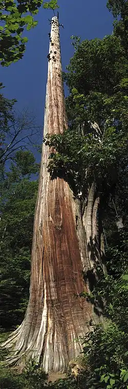 Two landmark trees were affected. One tree that has achieved a lot of fame is the National Geographic Tree, so named because it appeared in the magazine's October 1978 issue. With a circumference of 13.5 m (44.3 ft), it was once one of the more impressive big western red cedars of the park. It diminished over time, ravaged by storms, a lightning strike, and topped by park staff to a height of 39.6 metres (130 ft) before being uprooted in October 2007.[54][55][56]