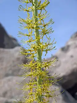 Stanleya elata is a species of flowering plant in the family Brassicaceae known by the common name Panamint princesplume.[1] It is native to the desert mountains of eastern California and western Nevada, where it grows in rocky and scrubby habitat types. It may also occur in Arizona.[2] It is a perennial herb producing one or more erect stems reaching about 1.5 meters in maximum height. They are hairless and often waxy in texture. The thick, leathery leaves have lance-shaped or oblong blades with smooth or toothed edges measuring up to 15 centimeters long. They are borne on petioles. The top of the stem is occupied by a long inflorescence which is a dense, snaking raceme of many flowers. Each flower has four narrow, threadlike yellow or whitish petals each about a centimeter long and a millimeter wide. The fruit is a long, thin, wormlike silique which may be 10 centimeters in length. It contains tiny seeds.