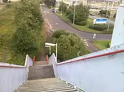 A footpath leads from the road to a flight of 48 steps with 2 rest landings and a handrail onto a footbridge. From the footbridge to the left, the first flight of 30 steps with rest landing and handrail leads to the Helsby platform, and the second flight of 30 steps with rest landing and handrail leads to the Ellesmere Port platform. The station is definitely not accessible for people with mobility problems.[11]