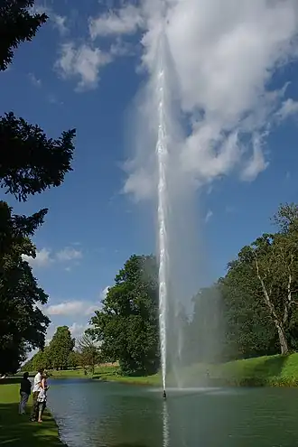 The Stanway Fountain was opened on 5 June 2004 in the grounds of Stanway House. The single-jet fountain, which rises to over 300 feet (91 m), is the tallest fountain in Britain (followed by Witley Court at 121 feet (37 m)), the tallest gravity-fed fountain in the world[17] (followed by the Fountain of Fame at La Granja de San Ildefonso, Segovia, Spain at 153 feet (47 m)), and the second-tallest fountain in Europe, after the Jet d'Eau, a 400 feet (120 m) high turbine-driven fountain in Geneva, Switzerland.[6] The fountain has a 2 inches (5.1 cm) bronze nozzle and is driven from a 100,000-imperial-gallon (450,000 L; 120,000 US gal) reservoir, above the canal in which it is situated. The reservoir is 530 feet (160 m) above the canal.[3] The 12 inches (30 cm) diameter pipe which feeds the fountain is 2 kilometres (1.2 mi) long.[19]