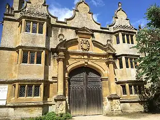 Stanway House, originally constructed in the late 16th and early 17th century for the Tracy family, is a Grade I listed building.[2] The principal rooms are in a long south-facing range forming an L-shape with the hall, unlike the usual Tudor house plan of a central hall. The north-east wing, remodelled in 1913 by Detmar Blow, was demolished in 1948. The kitchen court was designed by William Burn in 1859. The gatehouse was built in about 1630. The construction includes Guiting yellow stone and some Jacobean mullions and gables.[3]