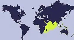 This species is distributed in the Red Sea and in the Indian Ocean along Aldabra, Chagos, the Comores, the East Coast of South Africa, Kenya, Madagascar, the Mascarene Basin, Mauritius, Mozambique, Réunion, the Seychelles, Somalia, South Mozambique, Tanzania and in Polynesia, Australia and Vanuatu.[4]