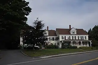 The Old Orchard Beach Inn is prominently located in the center of Old Orchard Beach, on the west side of Portland Avenue (Maine State Route 8), opposite the town hall. It is a 2+1⁄2-story wood-frame structure, with two large blocks, that on the left offset to the rear. Both have side-gable roofs and are finished in clapboard siding. The right block has a hip-roofed porch extending across its width, and both sections have gabled dormers projecting from the roof. The right block's interior includes 18th-century features such as a narrow winding staircase, low ceiling, and fireplace mantel.[2]