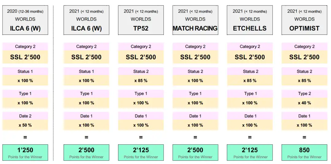 | Status | 1 | OLYMPIC CLASS | 100% | Olympics + Particularities: 49er, 49erFX, ILCA 7, ILCA 6, Nacra 17 Mixed, 470 Mixed + Current America's Cup Class + Match Racing Grade W + Grand Prix I |