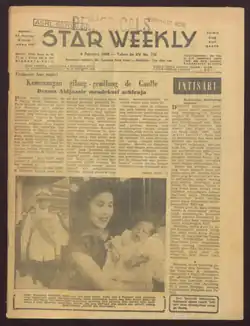 Star Weekly was the group effort of a number of Peranakan journalists who had been active in the late colonial era in the Dutch East Indies but who had been censored or even imprisoned during the Japanese occupation of the Dutch East Indies.[1] It was launched in January 1946 as a monthly magazine published by the daily newspaper Keng Po and its publisher Khoe Woen Sioe.[2][3] (According to some sources, it was a relaunching of a short-lived magazine published by Keng Po from 1939 to 1941 called Star Magazine, although that publication had a different format and editorial board.[4]) The first editor-in-chief of Star Weekly was Tan Hian Lay.[1] Petrus Kanisius Ojong, a prominent businessman and journalist who was editor-in-chief of Keng Po, joined the editorial board and writers of Star Weekly and would soon become one of its key figures.[1][2] Like Keng Po, Star Weekly was loosely affiliated with the Socialist Party (Indonesia). Because the Indonesian National Revolution was still underway, and Star Weekly was published in Dutch-held territory, it had to abide by censorship of military reports and be wary of seeming to be a tool of the Indonesian Republicans.[5] During the wartime years the paper also advocated for the Chinese population of Displaced Persons in Java who did not have the support of a foreign embassy due to the ongoing Chinese Civil War.