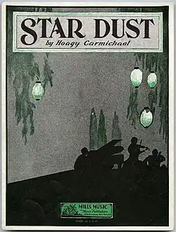 Carmichael wrote the song with inspiration from the end of his love affair with Kathryn Moore, who would later marry Art Baker, the trumpet player in Carmichael's Collegians.[9] While Carmichael related several explanations of how he was inspired to write it on the University campus, biographer Richard Sudhalter deemed the stories "encrusted in myth, much of it the composer's own creation".[10] One night after leaving the Book Nook, a university hangout, Carmichael whistled what would become the opening of the song. The composer later declared that he felt that the tune "had something very strange and different".[11] He worked on the details with different pianos, including one at the Book Nook. According to Ernie Pyle, the composer did further work at the Carmichael family's home.[9][12] While he visited Carmichael, Pyle asked him to play the song he had been working on.[11] Pyle later commented that Carmichael asked him not to reveal the details of the night he worked on the song with the family's piano, saying "the public likes to think these sweet songs are conceived under the moonlight, amid roses and soft breezes".[9] Carmichael finished the details of the composition on a grand piano that was later thrown away because of its poor state.[10] Baker and Carmichael's Collegians' singer Violet Deckard Gardner remembered Carmichael humming the tune of the incomplete composition before 1926.[9] Fellow student Stuart Gorrell suggested the title "Star Dust";[13] Gorrell felt the tune sounded like "dust from stars drifting down through the summer sky".[14]