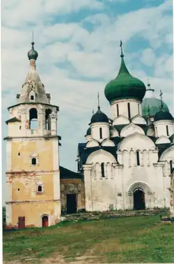 The town was established in 1297 under the name of Gorodok (Городо́к), lit. small town).[3] In 1365, it was moved from the more elevated right to the lower left bank of the Volga River. Since the 15th century, the town has been called Staritsa (lit. former river-bed). The name was misinterpreted by heraldists who represented on Staritsa's coat of arms an image of aged nun, which is another meaning of the Russian word "staritsa". In the 14th century, it belonged to the Principality of Zubtsov, which was eventually merged back into the Principality of Tver. In 1485 it was formally annexed by the Grand Duchy of Moscow. The Golden Age of the town began. Between 1519 and 1597 the Principality of Staritsa, subordinate to Moscow, existed with the capital in Staritsa.[3] The principality was ruled by Ivan III's son Andrey, and then by Andrey's son Vladimir. While Ivan the Terrible had no children, Vladimir was regarded by boyars as his only heir. As the Tsar suspected Staritsa's ruler of plotting against him, Vladimir and his children were forced to take poison. The opulence of Staritsa during Vladimir's reign can be seen in the Dormition Monastery.