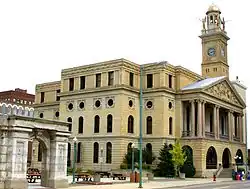 The Stark County Courthouse and its Annex are listed on the National Register of Historic Places for Canton, Ohio. The courthouse building was designed by Cleveland, Ohio based architect George F. Hammond in 1895.[2] The building is considered to be in the Beaux Arts Architecture style reflecting Classicism styles. The clock tower is also adorned with statues of trumpeting angels.