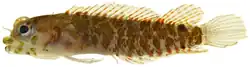 Adult Starksia atlantica can grow to 2.5 cm (0.98 in) in length.[2] It is an elongated shape with a continuous short dorsal fin running most of the length of the body. The colour is variable, being mostly mottled brown on a silvery background with larger dark spots above. The dorsal fin has 18–19 rays, the anal fin 7–8 rays, the pelvic fins have 15–16 and the pectorals 14 rays.[3]