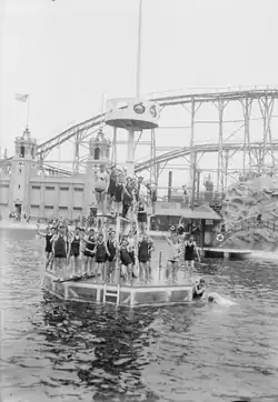 Starlight Park amusement park featured fireworks displays, a roller coaster, a swimming pool, and carnival games of skill and chance.[6] The initial attractions were built for the Bronx International Exposition. The swimming pool was marketed as the world's largest saltwater pool, measuring 300 by 350 feet (91 by 107 m) with a capacity of 2,500,000 U.S. gallons (9,500,000 L), and ranging from 0 to 10 feet (0.0 to 3.0 m) deep. The pool contained diving boards and a wave pool machine at the deep end, as well as a 50-by-55-foot (15 by 17 m) beach with sand brought from Rockaway, Queens.[47]: 536 [48] The fair also contained a scenic ridable miniature railway on the Bronx River, a "mountain" exhibit with a 65-foot-tall (20 m) waterfall, and a hotel nearby.[47]: 536–537 LaMarcus Adna Thompson built a wooden roller coaster at the site,[48] which featured a dual track.[49] The Eli Bridge Company's Ferris wheel from the Panama–California Exposition was brought over to the Bronx World's Fair.[48] Other attractions included a bathing pavilion that could fit 4,500 people; a convention center; and 15 large pavilions, including Chinese and North Sea-themed pavilions, as well as those for fine arts, liberal arts, and American achievements.[48][50]
