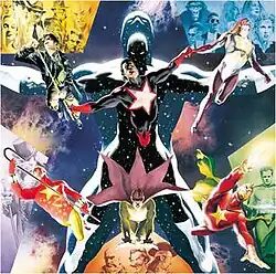 ![]() A collage of various Starmen (clockwise from top): Thom Kallor (background), Mikaal Tomas, Ted Knight, the Starman of 1951, Prince Gavyn, Jack Knight, and Will Payton (center). Art by Tony Harris and Alex Ross. | |