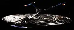 A third-season episode of Enterprise involves Captain Archer being transported to the 26th-century Enterprise-J. Doug Drexler drew the first design only two days prior to the production meeting for the episode. The computer-generated model was created in a few hours, and Drexler later said that they would have finished it differently.[8] He imagined that the vessel was so large that there would be universities and entire parks on board, with the turbolifts replaced by short range transporters. More than one design was created, with the final version created with elements from different designs.[9]