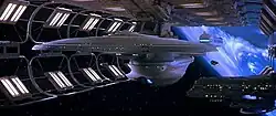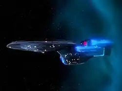 This ship appears in the penultimate episode of Star Trek: Picard (2023) at the Frontier Day festival. The ship was originally designed by Adam Ihle as part of a fan competition for Star Trek Online.[10] Ihle's design has a "familiar and recognizable" shape while also offering an evolution in design.[10] Star Trek Online artist Thomas Marrone updated the video game asset, and then sent the model to the series artists to incorporate into the show.[11]