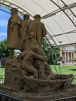 Borglum designed the memorial at his studio in San Antonio, Texas in late 1936 and 1937, working in plaster of Paris.[1][4] From this full-scale rendering, a small clay maquette was made, and given to stonemasons engaged using Works Progress Administration funding as part of the New Deal.[1] They sculpted the design from an 80-short-ton (73 t) block of sandstone from a quarry near the old lock number 18 on the Ohio River at a workshop at Briggs Station.[1][4]