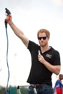 With security after the September 11 attacks on the US becoming prevalent and causing issues with starting pistols,[3] a trend developed to use electronic starting systems that do not use pistols but use a "dummy" prop pistol or a signaling device similar to those used on game shows which cannot function as a firearm and that is wired to the timing system. When the starter presses the button, they emit a signal to play a simulated gunshot that is broadcast to loudspeakers behind each lane, show a flash from the gun, and start the timing clock. Many venues have switched to the new format.[4] Beyond the security concerns, it was observed that the additional time for the sound to reach the athletes further from the pistol did have a measurable impact on starting times. This delay existed even when using a combination of a real gun and electronic system. Some competitors would still wait for the actual sound of the gun to reach them, rather than starting when the speaker behind them played the start sound. Since the new all-electronic starting pistols have no such problems, they became the official way of starting games at the 2012 Summer Olympics.[5]