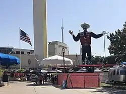 Big Tex, a 55-foot (17 m) tall cowboy statue, has been its symbol since his introduction in 1952. In 1953, Big Tex's jaw was hinged, so that he appears to "speak" the announcements that promote fair events.[23] After a fire on October 19, 2012, destroyed the original Big Tex, he was rebuilt and reintroduced for the 2013 fair. Big Tex is claimed to be the world's tallest cowboy.[24]