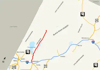The route begins at a junction with SR 427 in Wadsworth. The highway proceeds north following the path of the Truckee River, and passes along the east side of the river's terminus at Pyramid Lake near Nixon. The section of highway from Wadsworth to Nixon is named the Arthur S. Jackson Memorial Highway,[4] Jackson was a Paiute who was a heavily decorated soldier in World War II.[5] The highway continues north following the western edge of Winnemucca Lake, a dry lake that once also was the terminus of the Truckee river. During this portion the highway straddles the Washoe/Pershing County line.[2]