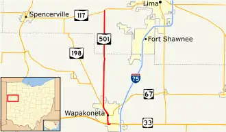 State Route 501 (SR 501) is a north–south state highway in Auglaize and Allen counties, Ohio. The southern terminus of SR 501 is at an interchange with U.S. Route 33 (US 33) just south of Wapakoneta, which is also the western terminus for SR 67 and the southern terminus for SR 198. The route runs concurrently with both of the latter two routes into Wapakoneta, and with SR 198 only north of the city. SR 501’s northern terminus is at SR 117 approximately six miles (9.7 km) west of Lima.