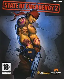 State of Emergency 2 is a 2006 third-person shooter video game developed by DC Studios and released exclusively for the PlayStation 2. Versions for the PlayStation Portable, Xbox, and Microsoft Windows were set for release, but were cancelled.[1][2] It is the sequel to 2002's State of Emergency and takes place four years after the first game. It features more game modes and an enhanced engine. State of Emergency 2 was being developed by VIS Entertainment for Rockstar Games, but the title was continued by SouthPeak Interactive with developer DC Studios.