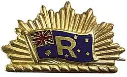 An official badge was created for the movement, based on the Australian Army's Rising Sun badge with the addition of an Australian flag emblazoned with a capital "R" for Riverina. The badges, manufactured by Angus & Coote, were sold by the movement's women's auxiliary.[7]