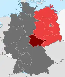 The Thuringian State Parliament was elected in 1946 in semi-free state elections. Thuringia received a new constitution on 20 December 1946.[5] After the political parties were brought into line with bloc parties, it was determined in the unfree State elections in the GDR in 1950 according to unity lists. With the reorganization of the GDR into districts (Bezirke) in July 1952, the state transferred its administrative functions to the three new districts. The area of the state now consisted of the districts Erfurt, Gera and Suhl. In December 1958, the state of Thuringia was formally dissolved.